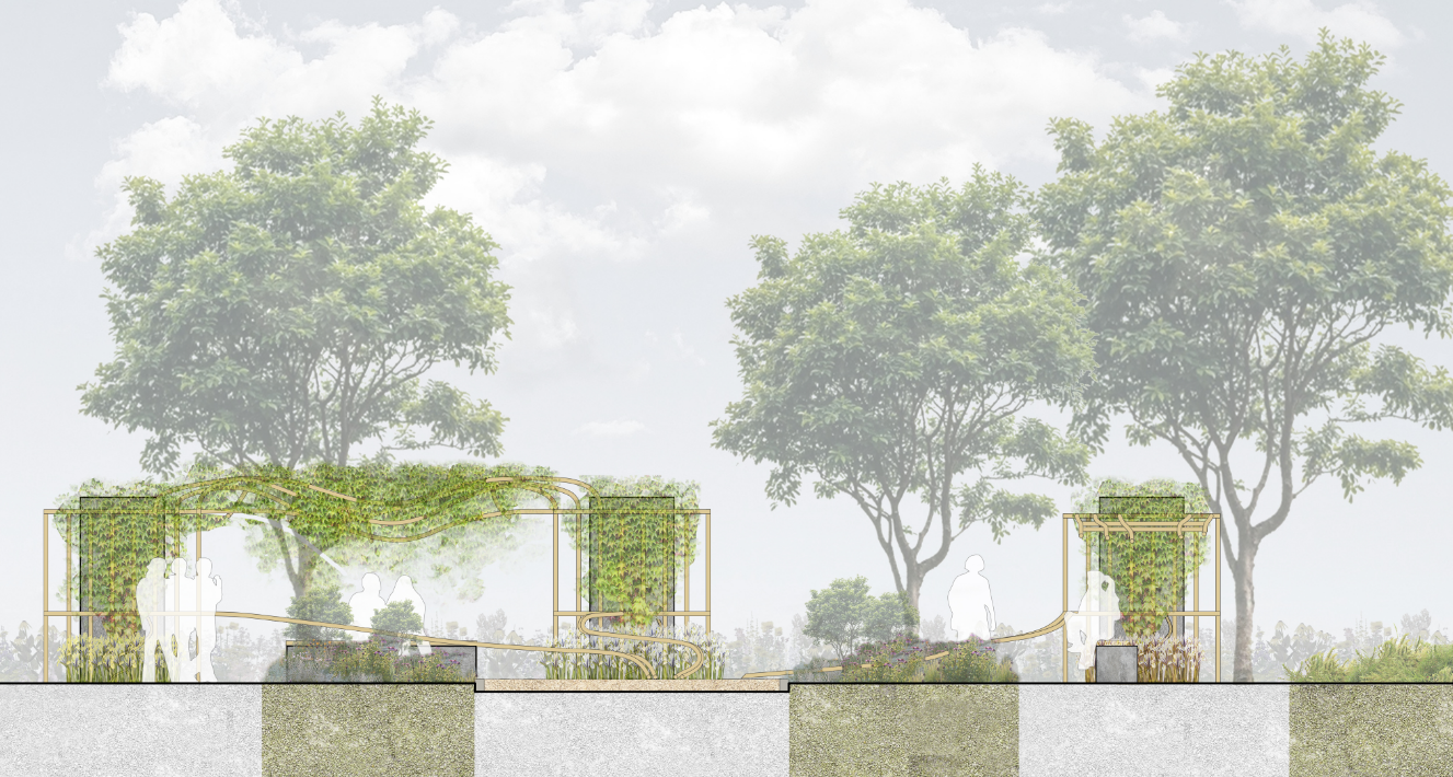 Relating to the overarching theme of the K-Wave, each of the outer columns symbolizes a key contributing factor that initiated or supports the cultural phenomenon. Each factor is assigned a specific color, represented by a particular variety of iris. The center unites these colors. The transition between inside and outside is meant to be soft and seamless. For this reason, grasses that sway in the wind like waves are primarily used in the transition zone.
